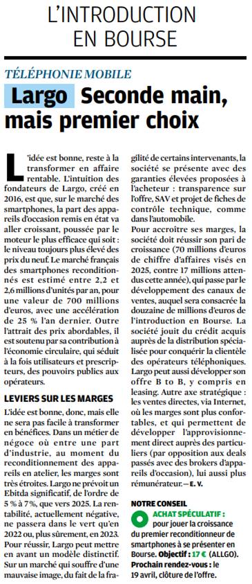 - 08/04/2021 LES ECHOS - Largo, spécialiste du reconditionnement des smartphones, va entrer en Bourse