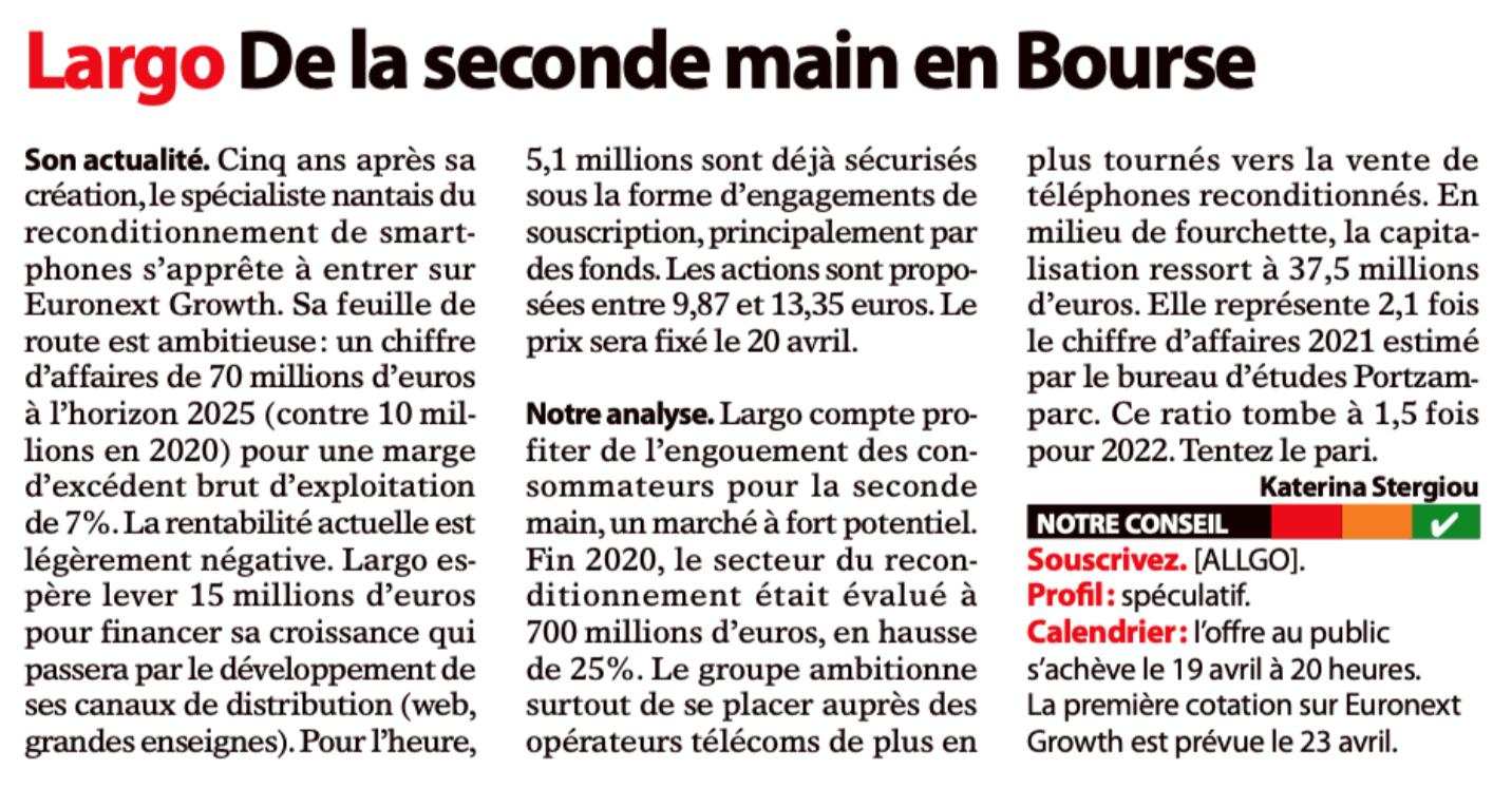 - 08/04/2021 LES ECHOS - Largo, spécialiste du reconditionnement des smartphones, va entrer en Bourse